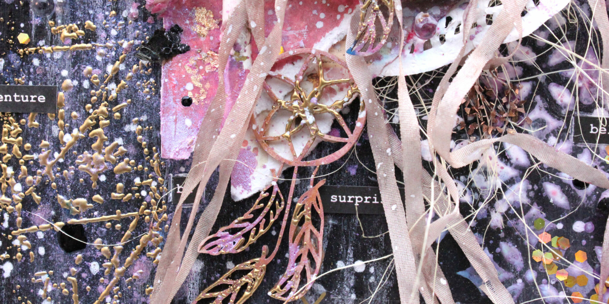 fekete gesso, fehér gesso, modellpaszta, indigólila szivárványpor, piszkos rózsaszín mist, arany akrilfesték, gel medium, fekete mica pehely, lila mica pehely, mini üveggyöngy, feliratos chipboard, tündéres chipboard, álomfogó chipboard, Domestic Goddess szómatricák, Aura Rosa matrica