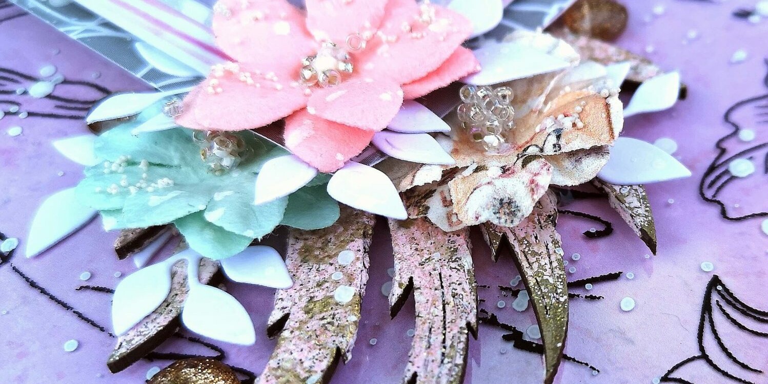Az egyik a Dusty Attic szárnya, amit a Cotton Candy domborítóporral színeztem meg. (Azt tudnotok kell, hogy ez a fajta domborítópor kivételesen nem az embossing pad-el, hanem a modellpasztával működik jól, azzal viszont tökéletes.) A hőlégfúvóval történt domborítás után Icing pasztával adtam neki arany effektet egy ecset segítségével.