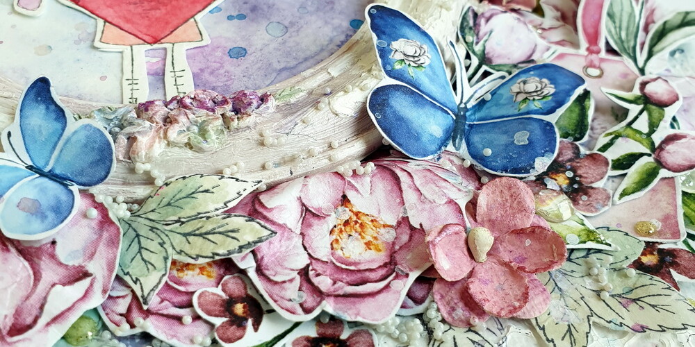 A virágokat és a pillangókat nagyon szeretem, ezért most nagy kedvencem az AB Studio Unexpected készlete. Ennek a készletnek a borítójáról és a kivágó ívről vágtam ki az elemeket (jó sok mesét néztem meg ezalatt a gyerekekkel 😀). Elrendezgettem, majd ragasztottam őket itt-ott sörkartonnal megemelve. Került a virágok közé még néhány pecsételt és kivágott viráglevél, pár darab gyöngy és “kristály”, majd fröcskölés, pecsételés ide-oda és kész. Ja és próbáljátok ki a prima metálos vízfestékjét is, mert csodásan csillogó és nagyon gyönyörű intenzív színei vannak. A fotón nem annyira jön vissza, no de élőben! … szóval csak ajánlani tudom.