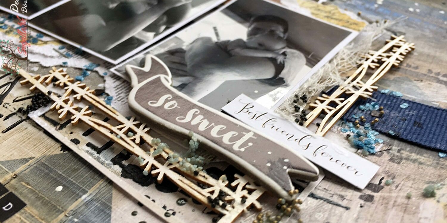 Alapnak a paint chips kollekció egyik chevronos papírját választottam, ezt először lealapoztam átlátszó gessoval, majd szilikonecsettel átkentem fehér gessoval. Amíg ez megszáradt, fekete gessoba kevertem egy kis magic port, hogy sűrűbb legyen (nekem a sima gessos stencilezésnél mindig megfolyt a minta), és stencileztem a technical és a figures stenciljeimmel. Amíg ez száradt, elkezdtem összepakolni a rétegzést: kék szalag (valamikor egy lidlben vett ruha csomagolása volt), erre a 4 fotóm fehér kerettel, alájuk pedig a writer’s block és a my precious boy papírjainak cafatkái.. plusz néhány tag keret (homegrown), kivágat (writer’s block), géz, sizzix vágat (köszi Anna), stiches szögesdrótos chipboard, cute&co szómatricák, plusz egy “best friends forever” felirat még az until dawn kivágataimból. Ezt követően bélyegeztem szerte-szét az oldalon (tipp: az aall and create bélyegzőkhöz NE használjatok stazOn tintát – én azzal próbáltam, és nem hagyott szinte semmi nyomot a papíromon… elkönyveltem, hogy vagy én bénázok, vagy baj van a bélyegzőmmel, de Zsanival egyeztettem, és stazOnt használva neki is ez a tapasztalata… később kipróbáltam egy másik oldalon a VersaFine-nal, azzal tökéletes!), majd felragasztottam a szórós díszítőket: fekete és arany mikrogyöngy, sötétkék mica pehely, fekete szív konfetti és egy kis szürkéskék dara. Direkt nem akartam most ezekből sok félét, mert a párom nem annyira rajong értük, és mégis csak róluk készült az oldal 🙂 A legvégén pacáztam fehér (épp van készleten!!) és fekete glitteres (mert simám MÉG nincs) splash tintával, és felragasztottam szó- és betűmatricákkal (főként domestic goddess salt and pepper) a feliratom.