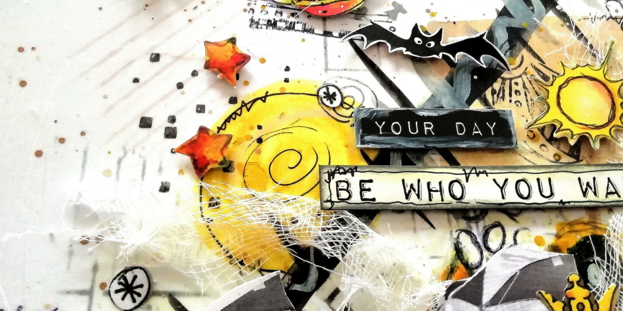 Megpróbálom felsorolni mi minden került az oldalra. Először is gézt tépkedtem meg és felragasztottam Magic ragasztóval. Sörkartonnal elemelve felkerült a Air Mail kollekció egy sárgás-barnás papírjából kivágott dombocska, melyre jó sokat bélyegeztem. Felragasztottam a fotókat. Majd a vízfestékkel befestett Just Chillin házikók és a ketté vágott Wonderland kör alakú sakktábla chipboard is megtalálta a végleges helyét. Hocus Pocus 6×8″-es kollekciójából kivágott állatkákkal és az Art by Marlene 3.0 des.4. kivágóív szettjéből válogattam még. Felkerültek a Soulmate matrica 01 ívről a feliratok is. Egy kis bélyegzés fekete tintával. Végül pedig a gel mediummal felragasztott Finnabair Art Stones, Mini Art Stones golyócskák.