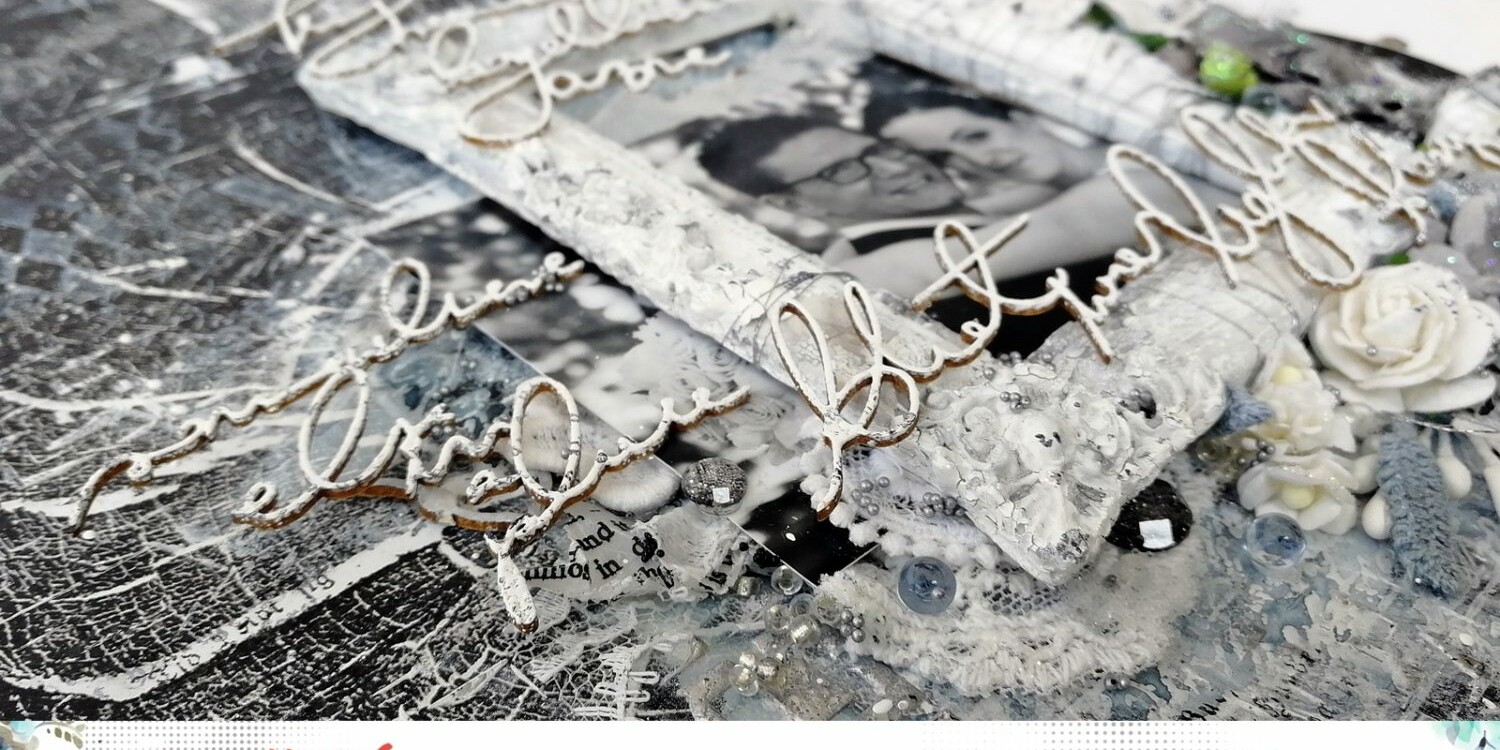 A 13arts egyik kivágóívét használtam alapnak, pontosabban a hátoldalát. Látni fogjátok, hogy miért 😀 Anno rögtön kettőt vettem, mert azóta készülök a hátoldal megscrapelésének. Szerintem gyönyörű! Már csak azért szorítok, hogy ne rontsak sokat rajta. Ez azért is fontos lenne, mert Dorkától elcsakliztam a táborban az egyik fekete-fehér esküvős fotójukat – privát fotócserés játékunk keretén belül.