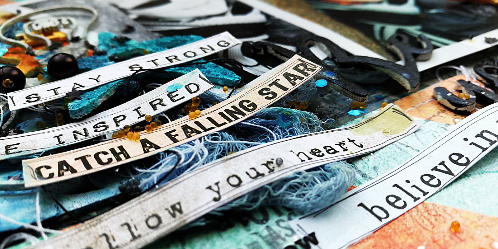 Mint minden mm alkotást, ezt is úgy kezdtem, hogy lealapoztam átlátszó gessoval a választott aprócsillagos Homegrown papíromat. Kivágtam egy csillagot fehér alapkartonból és a Cotton Candy készlet vibráló, narancs-türkizzöld chevron csíkos papírjából, és a csillag negatívját körbevarrtam, aztán felragasztottam a sarkokba. A koncepció már megvolt, így végigpötyiztem fehér Splash! tintával az egészet, no meg még feketével, türkizzel és naranccsal is. Pecsételtem rengeteget, majd jöhetett a kompozíciók kialakítása. Néhány csipit és a csipik negatívjait lefestettem, pár csillagot is, amikre véletlenül bukkantam, a címet fekete Splash! tintával, kellett még egy halom cérna és szintén festett gézlap. Meg még egy csomó kütyü, de hát ismeritek ezt! 😀