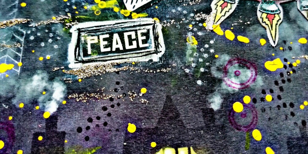 Az Art by Marlene papírtömbből kiválasztottam az éjszakai hátteres papírt, melyet Magic ragasztóval felragasztottam az oldalra. Fényes Mod podge médiummal lekentem az egész oldalt. Felragasztottam a kivágatokat, majd következett a legizgalmasabb rész a háttér felturbózása. 😀 Az oldal szélét fehér gessoval pacsmagoltam, száradás után pedig sárga színű Posca filccel rajzoltam körbe. Rengeteg bélyegzés és pacázás zárta a sort.