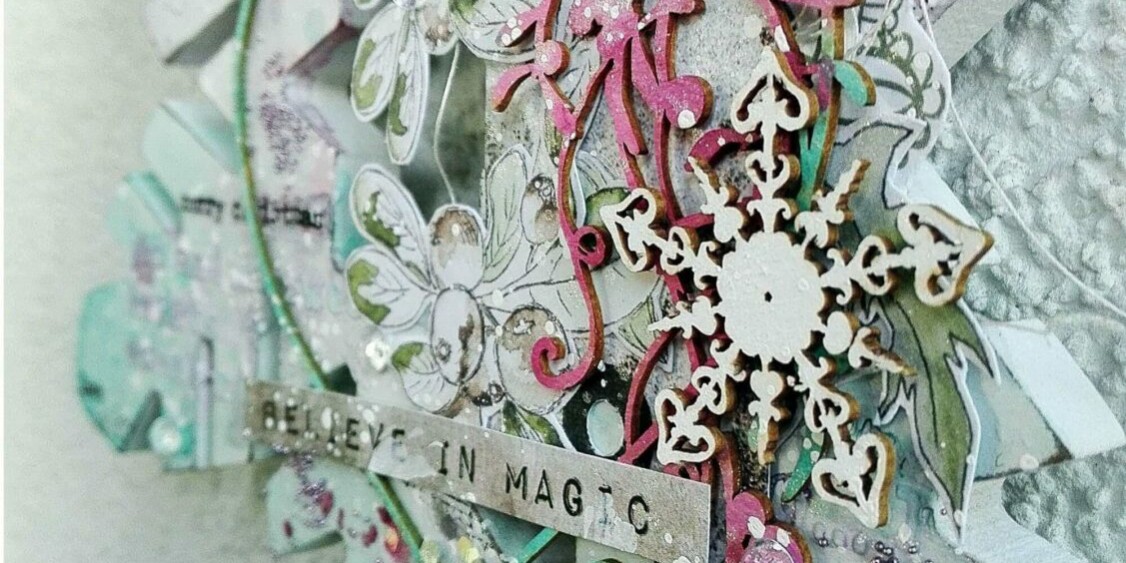 A színezést követően bélyegeztem rá egy kicsit, majd jöhettek a díszítőelemeim: pár karácsonyi felirat kaparós matricával, balra egy kis tag a Cotton Candy kollekcióból, ez alá csúsztattam egy kis cérnát. Erre jöhetett a mistletoe csipikből a szívecskés, amit a háttérhez használt mistekkel színeztem meg; két fagyöngy és pár levélke kivágás az új Craft o’Clock Winter Moments papírjából, egy hópihe csipi és egy szócímke a Northern Lights matricái közül. Szóródíszek közül főként az ezüst hologram csillámot és a bronz szív konfettit használtam, elszórtan pár üveggyönggyel, lila mica pehellyel és egy kis rózsaszín szórógyönggyel (fogalmam sincs, ilyenem honnan van, de szeretem…). Legvégül fehérrel pacáztam és shine misttel fújtam az egész felületet 🙂 És kész is. Nekem az összkép nagyon tetszik, és bár nekem ezek a színek kevésbé karácsonyiak, mégis jól esik ránéznem.. gyertek alkotni Ti is, még karácsony előtt 😉