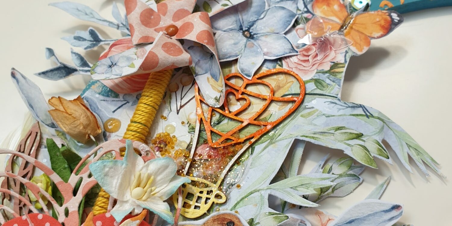 Amikor az alap összeállt, akkor a moodboard színeit használva készítettem apróságokat: bojtokat, szélforgókat, kivágatokat, kerestem elő színes madártollakat és a szivárványporokkal festettem fehér papírvirágokat, amiket kombináltam a shopban kapható papírvirágokkal. A sok vidám kiegészítő pedig a MintaybyKarola Bloomville papírjaival talált összhangra. Itt a kivágó ív elemeit és az egyik 12-es lapon levő óriás virágkoszorút kivágtam és ezzel építettem meg a rétegezett virágos alapomat. A papír alapszínein egy kicsit módosítottam vízfestékkel és a narancs szivárványporral, hiszen a sok rózsaszínes tulipánt, pillangót egy kicsit narancsosra színeztem át. Címnek, üzenetnek és egy-egy vidámság foltnak Scrapiniec chipboardokat használtam, amiket fehér, sárga Splash tintákkal színeztem meg. A szemcsés díszítők és egy kis festékfröcskölés után végezetül, mint hab a tortára, került fel fotóként a boldogságom forrása. Köszönöm!