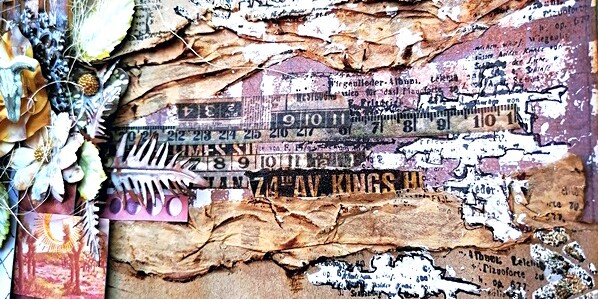 A barna kockás papírt választottam alapnak, majd egy kraft kartonból két nagy darabot téptem le és ragasztottam rá. A tépett széleket nem ragasztottam le teljesen, alájuk barna csomagolópapír került, amit előtte alaposan összegyűrtem. A tépett és gyűrött részeket Distress tintapárnával simogattam át.
