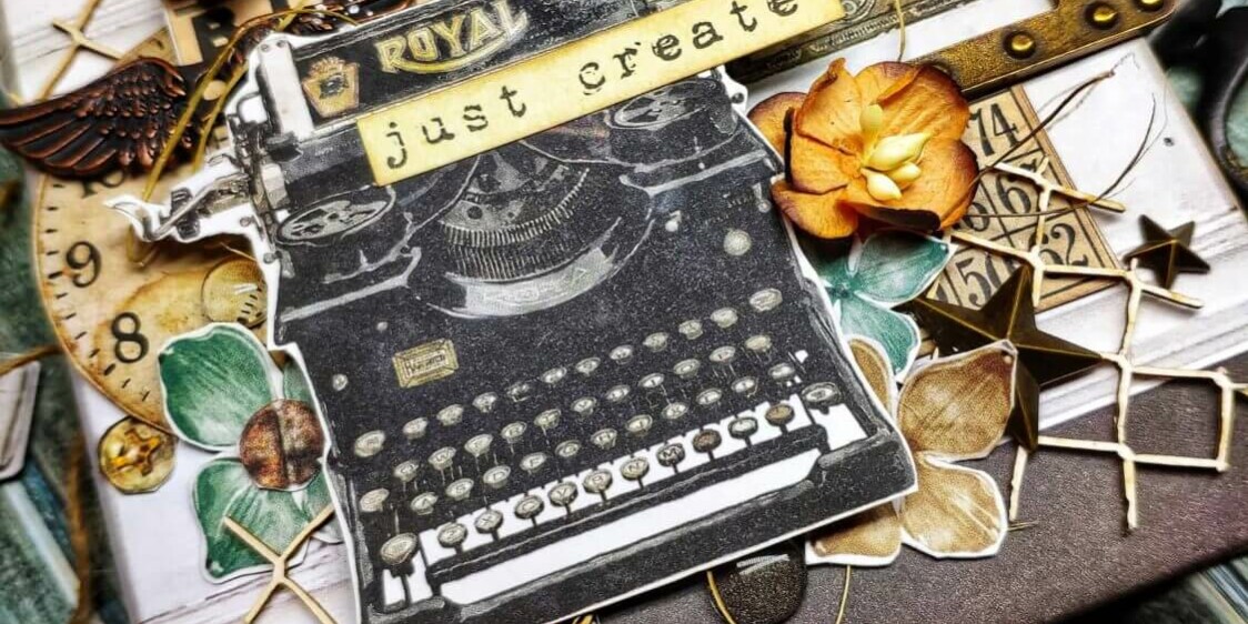 A gyönyörű Mintay – Life Stories kollekciót használtam. Szeretem, mert a kedvenc színeimet tartalmazza: barna, türkiz és a vintage stílust tükrözi. És még miért? A kivágív sok elemet tartalmaz: ajtó, virágok, órák, fényképezőgépe és az imádott írógép! Szóval ezt használtam fel a borítómhoz. Imádtam!
