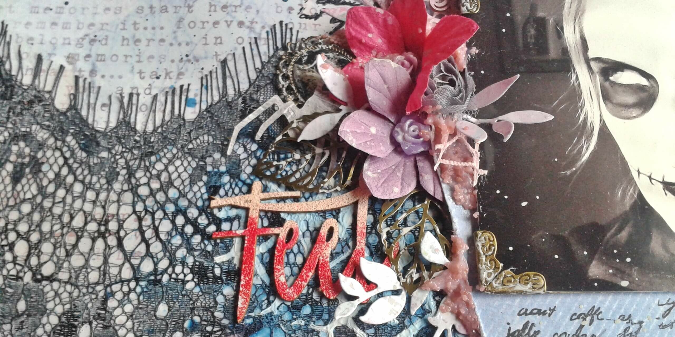 Először a fekete csipkét felragasztottam gél médium segítségével és utána a teljes oldalt lekentem clear gessoval. Mist és splash tinta segítségével alakítottam ki a festékcsorgást, ami mindenképpen kellett nekem a hangulathoz, de a színvilág miatt (és talán megnyugatás képpen ! ) nem vöröset, hanem kéket és rózsaszínt használtam.