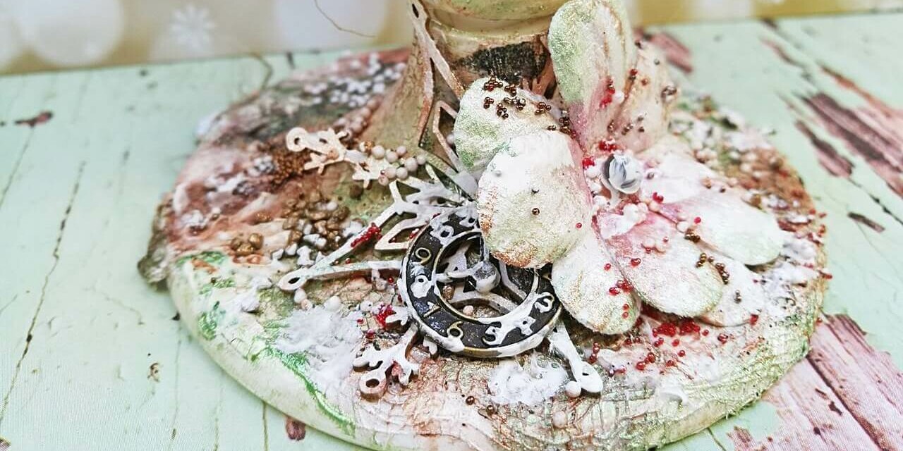 Ikeás képkeretet alapoztam fehér gessoval melybe gézt nyomkodtam. Erre repesztő pasztát kentem elszórva. Barna és zöld szivárványporral színeztem a keretet, nyomdáztam kicsit, hópelyheket stencileztem és már készen is volt a keret. Díszítésképpen egy kis pillangót, hópehely csipit és virágokat tettem fel amit kék és rózsaszín pigmentporral leheletnyi vékonyan színeztem, majd bronz pehellyel és kis hungarocellgömbökkel adtam életet a keretnek. Az első oldalt a 7 Dots Studio – Fortune Teller papírkollekcióból készítettem. A díszítés alatt átlátszó gessoval alapoztam és rétegeztem megmaradt papírokkal. Ezután kis sizál, chipboard számok, és virág díszítést kapott. A hangulatát itt is a darák, csillámok és hungarocell gömbök adták meg. Végezetül az egészet fehér gessoval finomítottam kicsit és felkerültek a szócímkék is. Ezzel az album és borítója el is készült 🙂