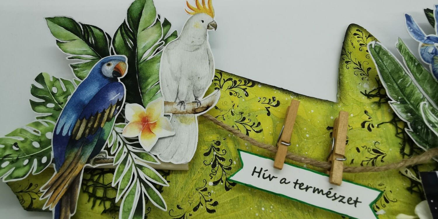Azzal kezdeném, hogy nem szeretem Jim Carrey filmjeit, de azért megnéztem, mint kiderült, a második részét, ahol egy denevért kell megtalálnia. Hát innen jött az ötlet, hogy egy denevér alapot fogok használni. Készítettem egy sablont, amit átrajzoltam a 2 mm vastag szürke kartonra. Erre sima fehér alapkarton került, amit alapozás után stencileztem, és színeztem a moodboardnak megfelelő színekkel. Nemrégen a barátnőmmel ellátogattunk az állatkertbe, próbáltam ráhangolódni a témára, így készült pár orrszarvús fotó, ami nem maradhatott ki semmiképpen. Miután az alap elkészült, felépítettem a kompozíciót, használtam faágakat, spárgát, kivágatokat, Prima és foamiran virágokat. Pecsételtem párat, pacáztam, és megszíneztem a denevér széleit fekete és sötét zöld tintával.