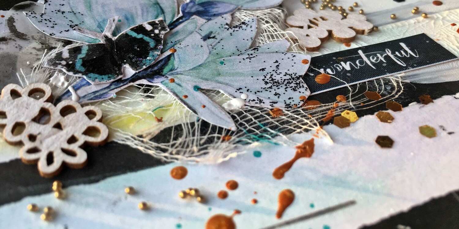 Mivel már tudtam, hova teszem a képet és a díszítéseket, tudtam, hova mehet úgy a repesztőpaszta, hogy látszódjon is, így vittem fel belőle viszonylag vastagabb rétegben a díszítéseim köré. Száradás után halványan festettem rá sárgával és türkizzel, amikor pedig ez is megszáradt, újra elkezdtem visszarakni a már kitalált kompozícióm (természetesen soha nem olyan lesz mint ahogy elsőre kitaláltam, de asszem ez normális :D). A fényképemet fekete fotókartonra ragasztottam, így most fekete keretet kapott a kép a szokott fehér helyett. Megemeltem chipboard maradékokkal, de csak úgy, hogy tudjak alá dugdosni még díszítőelemeket. A virágok egy része is meg lett emelve, így alá tudtam dugni a gézt és a szürke pékzsineget is. Fura, mert én eddig sosem tudtam a madarakkal mit kezdeni, most pedig kettőt is raktam az oldalamra 😀 A kis cuki dagi fekete csibeszerűséget, illetve egy szép kis kékes madárkát – ami leginkább egy gyurgyalag és egy jégmadár szerelemgyerekének tűnik, de ha valaki tudja pontosan milyen fajta, akkor szóljon 😀 Nem bírtam ki, muszáj volt 1-1 pillangót és 1-1 szitakötőt is felhasználni, így már teljes lett a kép. Miután mindent felragasztottam, bélyegeztem, pacáztam fehér és arany splash tintákkal, és fekete meg türkiz mistekkel. Használtam még szómatricákat a new moon kollekcióból, címfeliratot az Alice in candyland ívről, végül pedig szóródíszeket: fekete és fehér csillámport vittem fel akril liquid mediummal, arany mikrogyöngyöt, arany hexagon csillámot és fekete hexagon csillámot gel mediummal, legvégül mini üveggolyókat magic ragasztóval. És el is készült az én öröm-oldalam 🙂 Azt hiszem, gyakrabban kellene csakúgy oldalt csinálnom… nagyon feltöltött 🙂