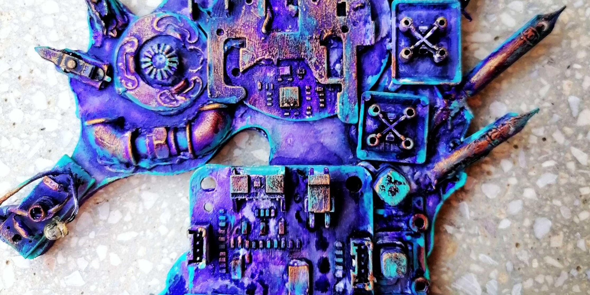 Mivel viszonylag sok altered art-ot készítek, így rengeteg kacatom van itthon, csak erre a célra 😊 Így most előkerültek a kiszuperált billentyűzet gombok, nyáklapok, kábelek, gombok, és szépen felköltöztek egy Woodouts! mdf alapra: