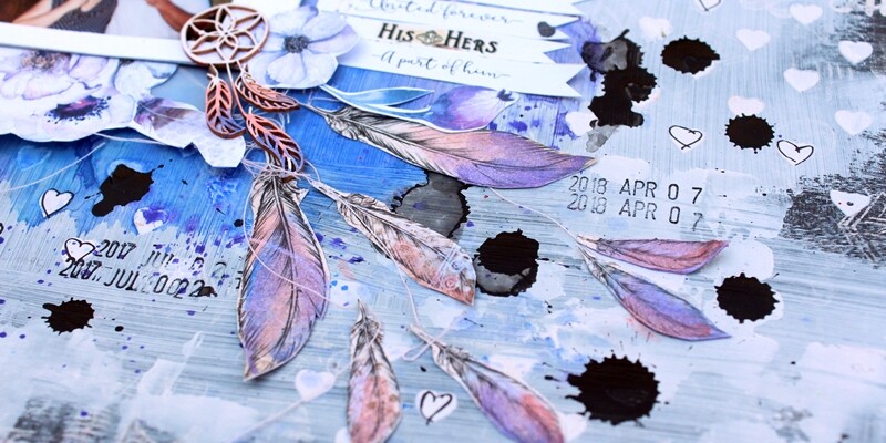 A His&Hers papírok aljáról levágtam a papírok nevét jelölő csíkokat, és a fotóm mellé ragasztgattam őket, a szépen írott szövegek remekül passzoltak a fotóm témájához ugyanis. Gyakorlatilag ezeket a kis papírcsíkokat használtam címként az oldalamon. Kevéske díszítőelemet használtam, nagyjából csak a papírvirágokat, egy darab álomfogó csipit, és a tollas papírból kivágott tollakat, amiket szintén vízfestékkel színeztem a kívánt árnyalatra. Ezután már csak apró finomítgatások voltak hátra, hatalmas fekete pacák a jobb alsó sarokba, illetve némelyik szív alkoholos filces körbefirkálása, dátumbélyegzés, ilyesmik.