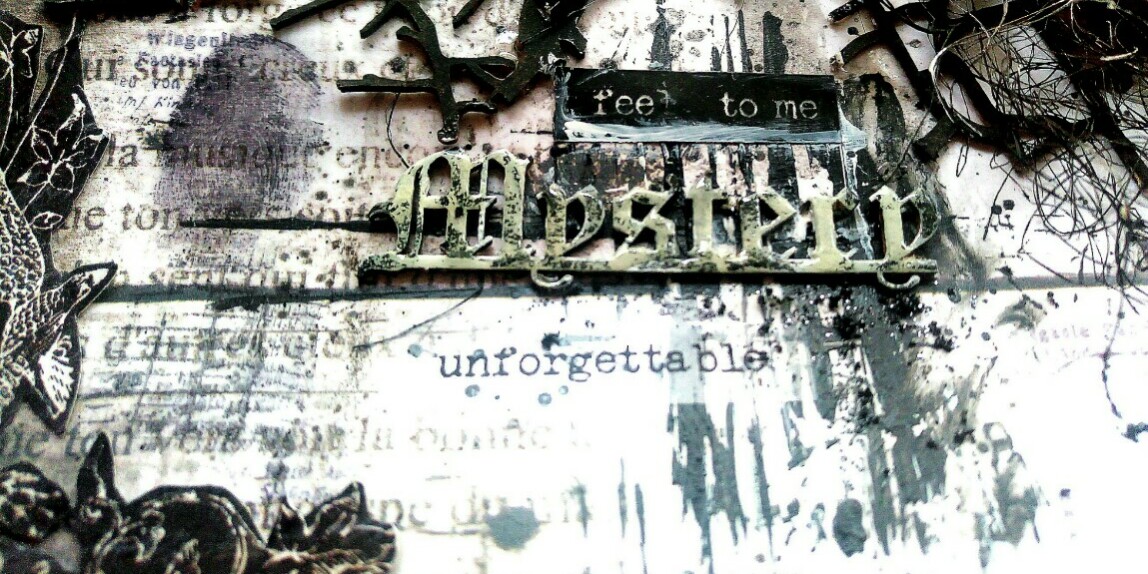 Az oldalam alapja a 7 Dots Studio Writer’s Block 12”-es kollekció egyik papírja, melyet lekentem átlátszó gessoval. The Great Book of Magic kitből a chipboardokat lekentem fekete vízfestékkel és fekete gessoval. Ezeket rétegeztem a fotó és a 13arts His and Hers Remastered 12”-es kollekcióból kivágott motívumok alá, fölé. A fotókat egy applikáció segítségével készítettem el. A horror story feliratot pedig Silhouette Cameoval vágtam ki, majd több rétegben átkentem fekete gessoval. Az oldalt díszítettem még fekete szizállal, tüllel, fekete mikrogyönggyel, 13arts fóliamatricákkal. Festőkés (spatula) segítségével random elhúzkodtam az oldalon a fekete és fehér gessot. Már csak a bélyegzés volt hátra fekete és szürke tintával és AALL & Create bélyegzőkkel.