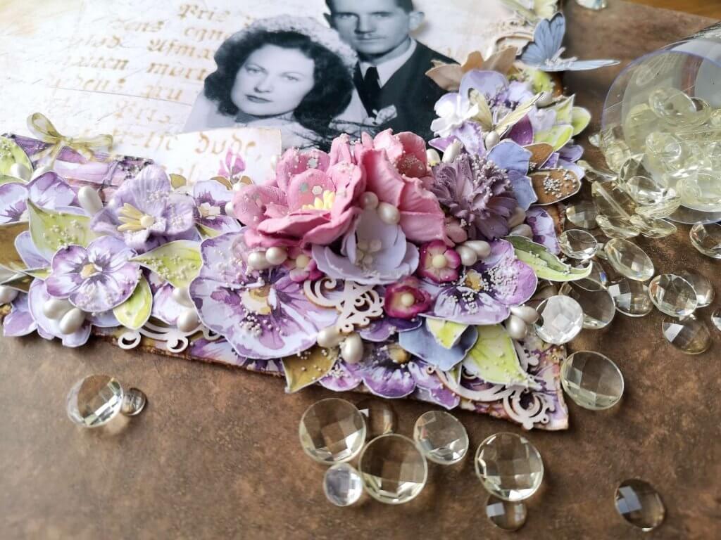 Az alkotás gerincét a Craft o’ Clock Reverie papírkészlete és a hozzá tartozó kivágóívek adták.