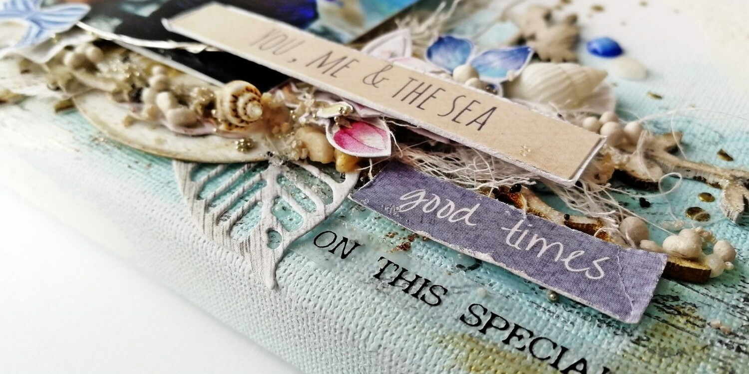Egy 15×15-ös vászonra dolgoztam. A repesztéssel kezdem, és a vízfestéssel folytattam. Utána stencileztem (Dots and Numbers Aqua Flora stencil, My Letters stencil) arany Ayeeda gyöngyház festékkel 😀 és átlátszó gessoval és modell pasztával. Pecsételtem és Bea vászna alapján rétegeztem a Marina kis tömbjéből. Lekentem a csipiket fehér gessoval és arany tintapárnával kicsit megszíneztem a széleit. Majd kivágtam néhány virágot a Hello Beautiful és a Marina kivágóívből, és összeszedtem néhány tengeres díszítőelemet: kagylókat, gézt, fémkütyüt, feliratos matricákat… Aztán centiről centire újra átvizsgáltam a vásznat és kiegészítettem még ezzel-azzal 😀