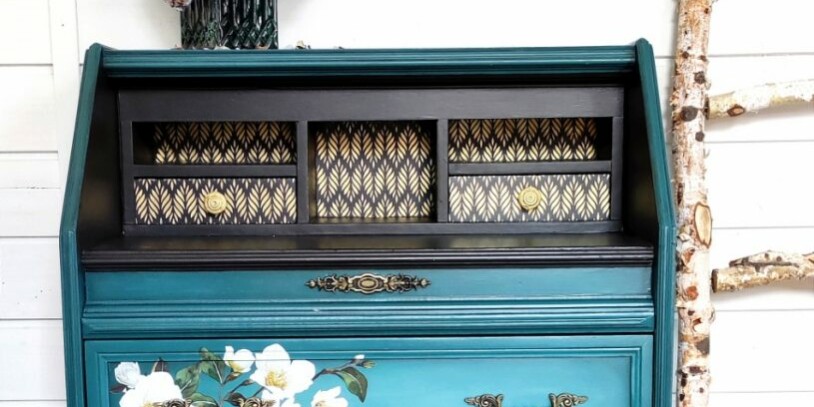 Ez egy elég rozzant állapotú kis szekreter volt, kopott barna színben. A fiókokon eredetileg rátétek voltak, ezeket eltávolítottam. Az ilyen kiálló díszítésekre nehéz transzferálni és a felrakott mintát is torzíthatják ezek a rátétek, így könnyebb és egyszerűbb is leszedni őket.