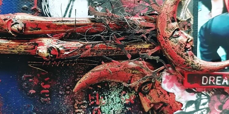 A díszítőelemeket akrilfestékkel, waxokkal, és Artisan porral festettem meg. A faágakat felragasztottam, majd elhelyeztem rajtuk a díszítőket. A Tim Holtz-os koponyák szemét pirosra festettem, szerintem nagyon ütős lett így. A fotó alá, és köré a Victoriana kollekcióból válogattam. Szerencsémre van itthon mindenféle színű madártoll, így ezt is óvatosan felragasztottam a vászonra. A fekete quote chips-ek (chipboard feliratok) nagyon sterilen hatottak, így ezeket is összemaszatoltam piros festékkel.