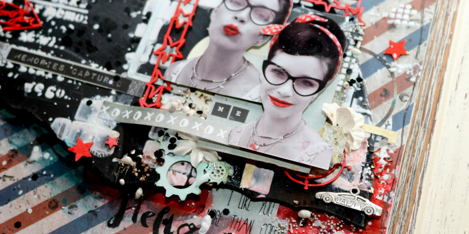 Aztán jött a bakelit lemez ötlet. Anyu úgyis kiselejtezett egy nagy doboznyit, milyen jó lesz ezt használni alapnak. De Dorka rögtön a legelején el is sütötte ezt az ötletet, így valami mást kellett kitalálni. Nekiálltam egy tagnek, de valahogy nem akart összeállni, így visszatértem a bakelit lemez témához. Hogy mégse legyen ugyanolyan mint Dorkáé, fogtam magam és kettétörtem a lemezt. Ezt ragasztottam fel egy kis kartonnal kikemelve egy scrapbook papírra (Air Mail maxi kollekció – 12×12). Előtte a papírt lealapoztam átlátszó gessoval. A moodboardon megjelenő kockás mintát stencilezéssel próbáltam megjeleníteni, amihez Ayeeda Modell Pasztat használtam. A fotóinkat körbevágtam és elrendeztem a kompzíciót az oldalamon. A rétegezéshez és díszítéshez használtam chipboardokat (Focus – kis keret szett, Focus – szögletes keret (des.4), Confetti – csillagok, Ecsetvonásos szerelmes nyilak), papírfecniket, egy-két papírvirágot, szómatricákat, és fekete csillámot. A lemez körül piros vízfestékkel kicsit megszíneztem a papírt (ugyanezzel színeztem a chipboardokat is). Pecsételtem még itt-ott, végül egy fekete tollal adtam keretet a lapnak.