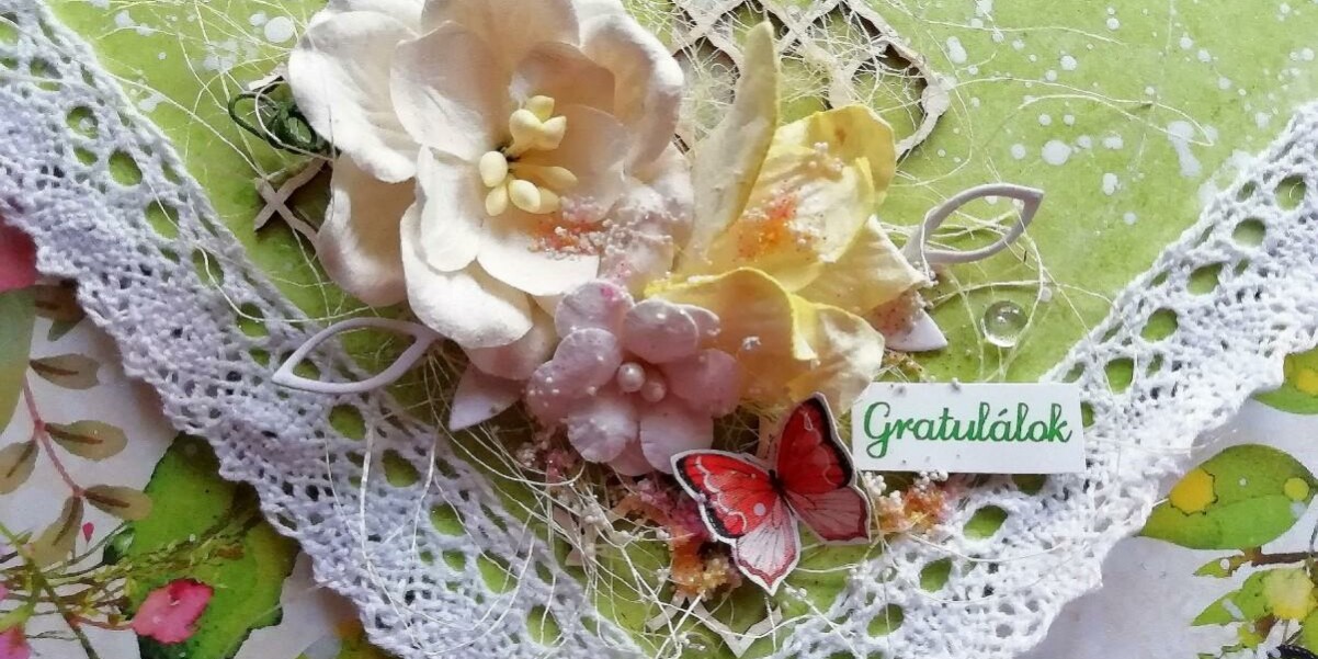 Mind a négy boríték alapja egy 12”-es Mintay papír a Birdsong, Springtime és a Together kollekciókból. A díszítéshez használtam fehér csipke szalagot, papírvirágokat, chipboardokat: Alamor bordűrök, Alamor szakadt háló, Grapevine szívek, kivágatokat, szizált, narancssárga göndör mohát és szemcsés díszítőelemeket: műanyagszemcse, borostyán mikrogyöngy, félgyöngy, csillám. Végezetül pedig felvizezett fehér Splash tintával pacáztam.