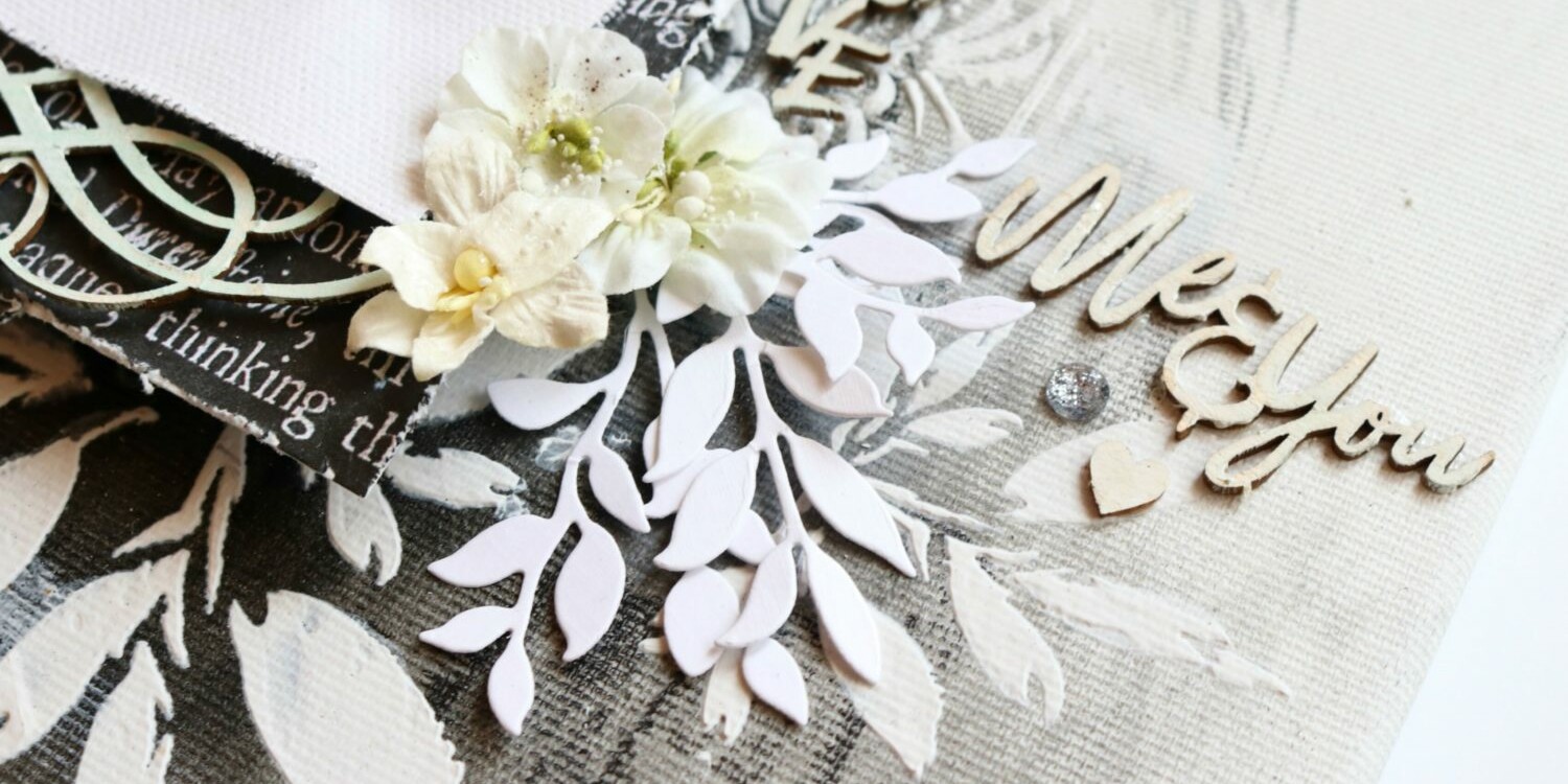 A kihívásra egy vásznat készítettem. A fotó mögötti részt fekete gessoval kentem le, majd a széleknél popsitörlővel kicsit vissza szedtem a színt. Ezután stencileztem, pecsételtem és ezüst domborport is használtam a háttérhez. A rétegezéshez a 13@rts papírkészletéből használtam egy papírt. Díszíteni pedig chipboardokkal, virágokkal és Sizzix kivágatokkal díszítettem.
