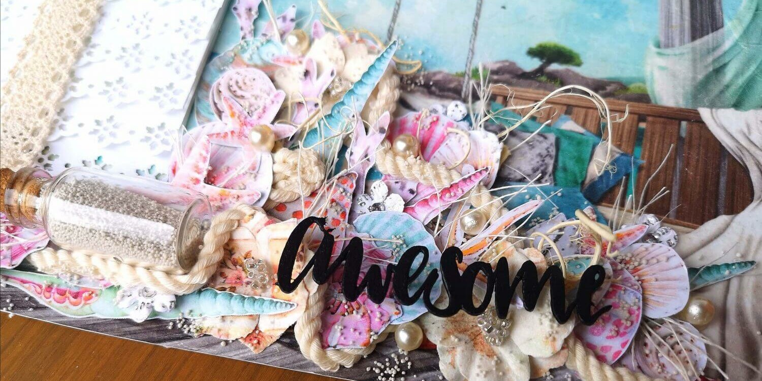 Díszítésként a Surfboard papírkollekcióját, arany csipkés kivágóívet, miniköveket, üvegcsét, gyöngyöt, néhány papírvirágot, göndörmohát és kötelet használtam.