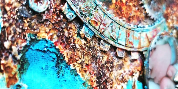 A vászon sima felületein és a fém kütyükön a kék színű akrilt használtam, ezt is alaposan felvizezve. A kék alapra ezután ugyanazokat a színeket vittem fel, mint a rozsdás részekre.