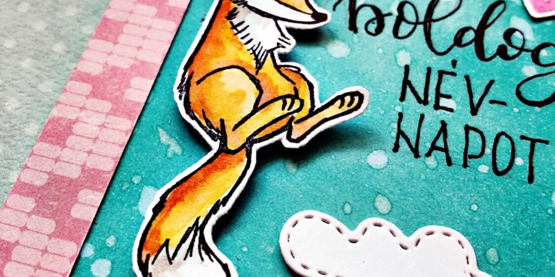 Ma a névnapos kártyát mutatom meg nektek. A csimpaszkodó kisróka és a lufi egyértelműen lufin lógászkodó rókáért kiáltott, így nem álltam ellen. Viszont a két figura együtt aránytalanul hosszú lett volna a normál méretű képeslapra. Persze ilyen apróság nem tántoríthat el, így leszabtam gyorsan egy 11,5×3,5 inches csíkot kartonból. Ez azért szuper méret, mert az A4-es lapból éppen kijön a hossza. A csíkot félbehajtottam és úgy döntöttem, nem használok külön előlapot, az alapra dolgozom tovább.