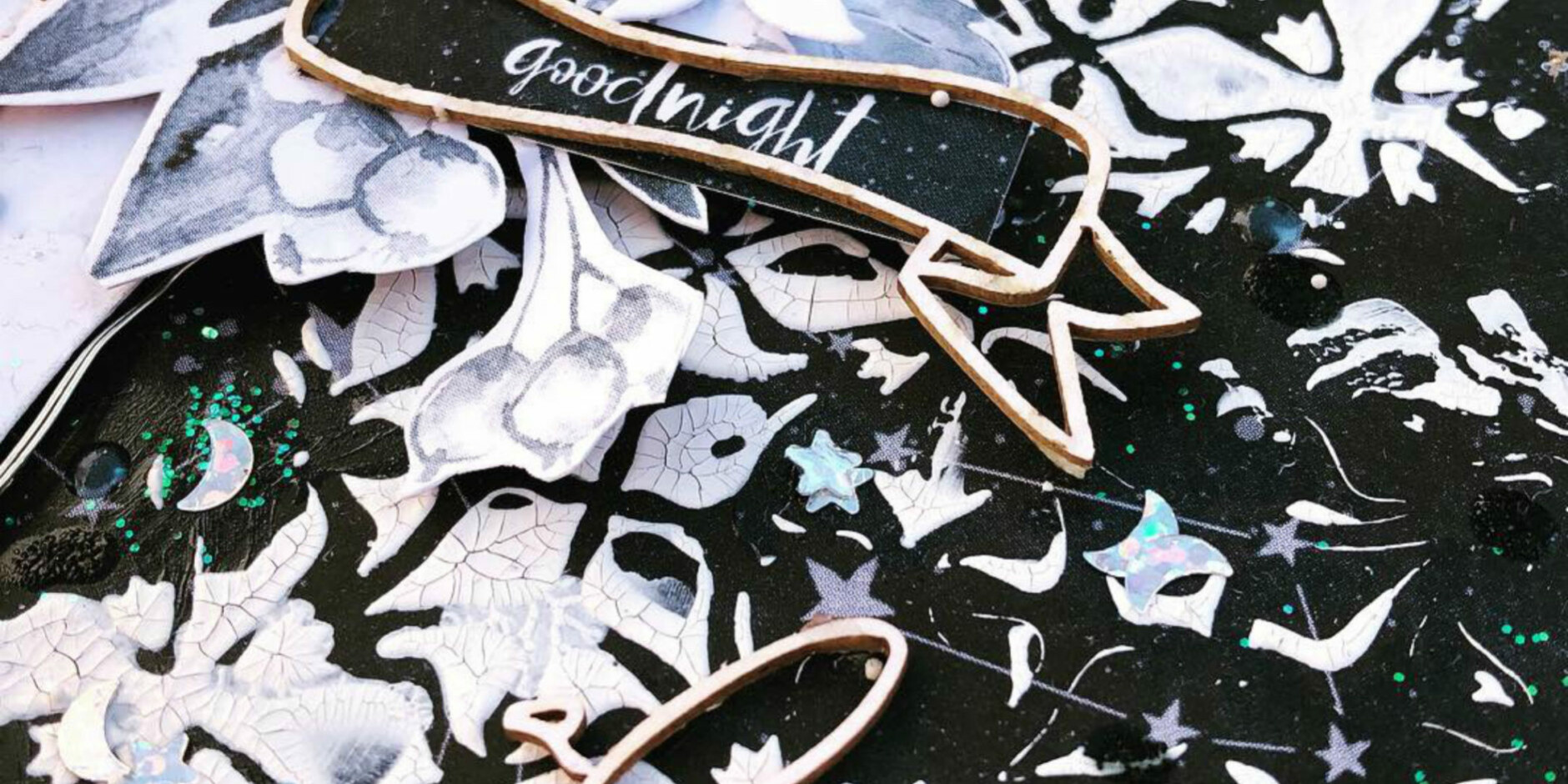 Na, kb. eddig a pontig volt meg az elképzelés a fejemhez, a díszítést Móni “könnyebb a levegőnél workshopja inspirálta. Az ő projektjén egy hosszúkás alakú fotó szerepel, amihez nekem nem volt alkalmas fotóm, így maradt az optikailag csalás, azaz két normál méretű fotót ragasztottam egymás alá kissé elcsúsztatva, így megnyújtva az elrendezést. A fotó mögötti területre stencileztem repesztő pasztával. Az apró repedések nem szembetűnőek, azonban azoknak akik szeretnek elveszni az apró kis részletekben (mint én), egy kis pluszt nyújt. A hátteret bélyegzéssel egészítettem ki. Soha nem használtam még fehér bélyegzőt, de a sötét alapon annyira jól mutat, hogy -Móninak hála- kénytelen leszek beszerezni egyet magamnak is. Dekoráltam még chipboarddal, némelyiket lekentem irizáló fehér splash tintával, ettől olyan sejtelmesen csillog. Használtam szómatricákat, virágokat, kivágatokat.