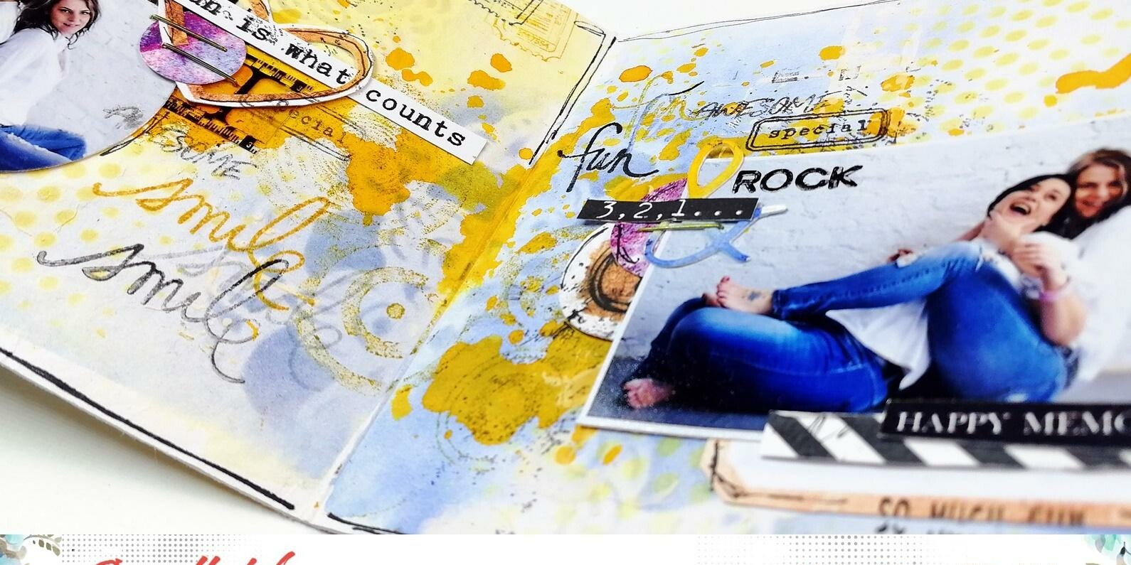 Az első oldalt a fél-lapnyi borítóval is összhangba kellett hozni, plusz az előző kihívásból beragadt nálam a kör forma 😀 Halványan rajzoltam két kört, jól bevizeztem, hogy folyatni tudjam rajta a színeket, plusz még vissza is tudtam szedni belőlük. Kilyukasztottam a borító sarkait, egy mini szegecset ütöttem bele és átfűztem rajta egy kalapgumit – ez rögzíti majd a kész albumot.