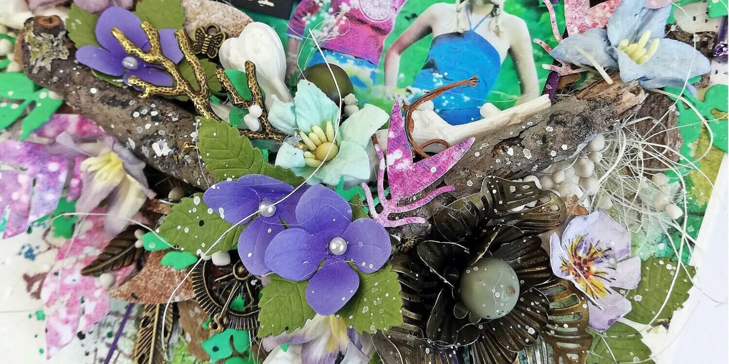 Szizállal, virágokkal és ágacskákkal dúsítottam a faág és az oldal közötti nagyobb hézagokat. Az elrendezés is igyekeztem liftelni: nálam a vízszintes faág a fotó alá került. A fotó alatt és függőlegesen pedig, tartva a fókuszt , építgettem be szépen sorban az elemeket.