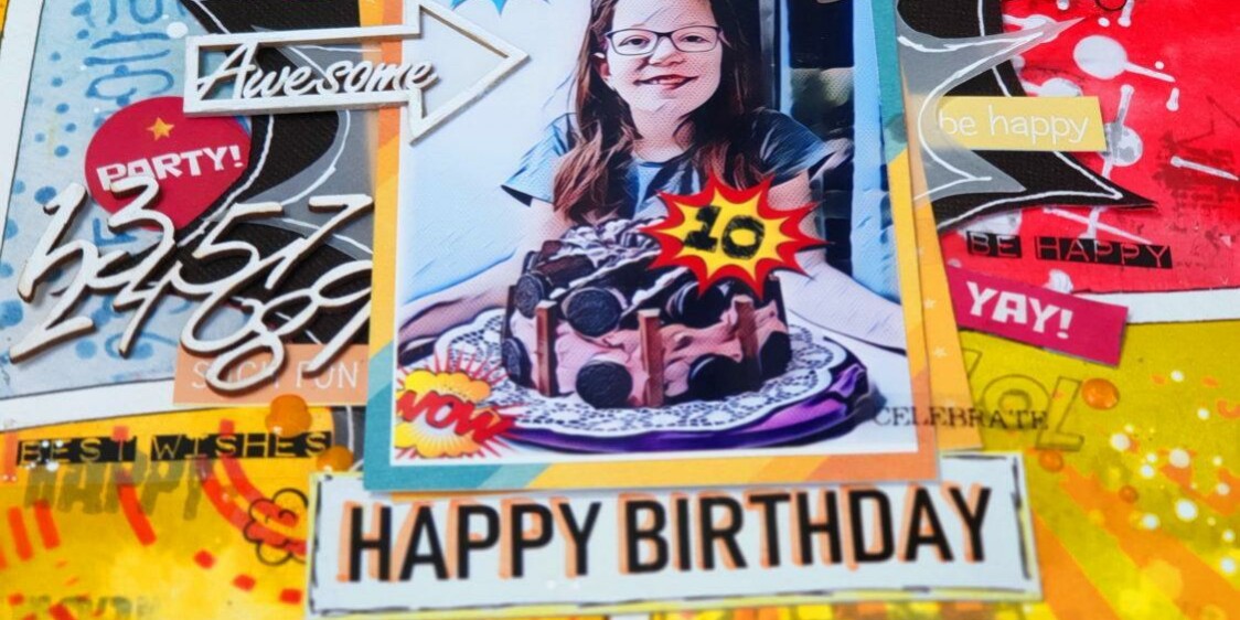 Petra kikereste melyik fotó legyen majd az oldalon, közösen a moodboardra igazítottuk a telefonon, majd nyomtattam és kezdtem az összeállítást. A Piatek Happy Birthday kollekció 6-os lapjaiból választottam a rétegezéshez, valamint fekete alapkartonból és pauszpapírból készítettem comic stílusú formákat. A szülinapos készlet matricáiból, valamint a scrapiniec nyilas szavak chipboard palettából és a 13artos Aqua Flora készletből a is használtam elemeket. Címet a 13artsos Speaking of which kartonból vágtam ki, majd egy kicsit megszíneztem. További gondolatokat szintén matricákból ragasztottam a kép köré. Került még az alapra pár enamel pötty és egy kis fehér festék fröcskölés is.