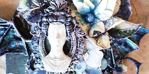 A Woodouts alapra egy ezeréves 13@rts papírt ragasztottam az Until dawn kollekcióból. Műgyantából kiöntöttem a formákat, ezeket lealapoztam és rétegenként megfestettem: első körben a Sodalite és a Cairo night került rá. Ezután kapott egy pöttyintésnyi alkoholos tintát (Tim Holtz Denim). Száradás után a folyékony akrilba kevertem a Lindy’s porokat és néhány helyen áthúztam a formákat. Zárásként egy vékony réteg csillámot és waxot is kaptak.
