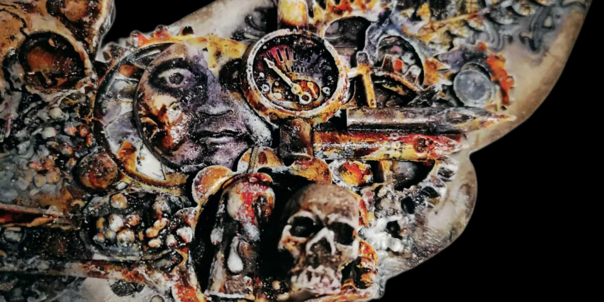 A Woodouts alapomat lekentem fehér gessoval, és egy rizspapírt ragasztottam rá, majd erre stencileztem. A stencilezett mintámat Lindy’s Black forest black shakerrel színeztem meg, majd egymásra rétegezve felragasztottam a fém díszítőket és a műgyanta formákat. Ezekhez a nehéz formákhoz mindig heavy body gel-t használok, mert, bár lassan szárad, de biztos, hogy sosem fog semmi lepotyogni. Tehát, 1 teljes napig hagytam száradni a felragasztott kütyüket, majd mindet alaposan lefestettem fekete gessoval. Szárítás után 2 réteg fehér gesso jött, így kaptam egy szépen színezhető alapot.
