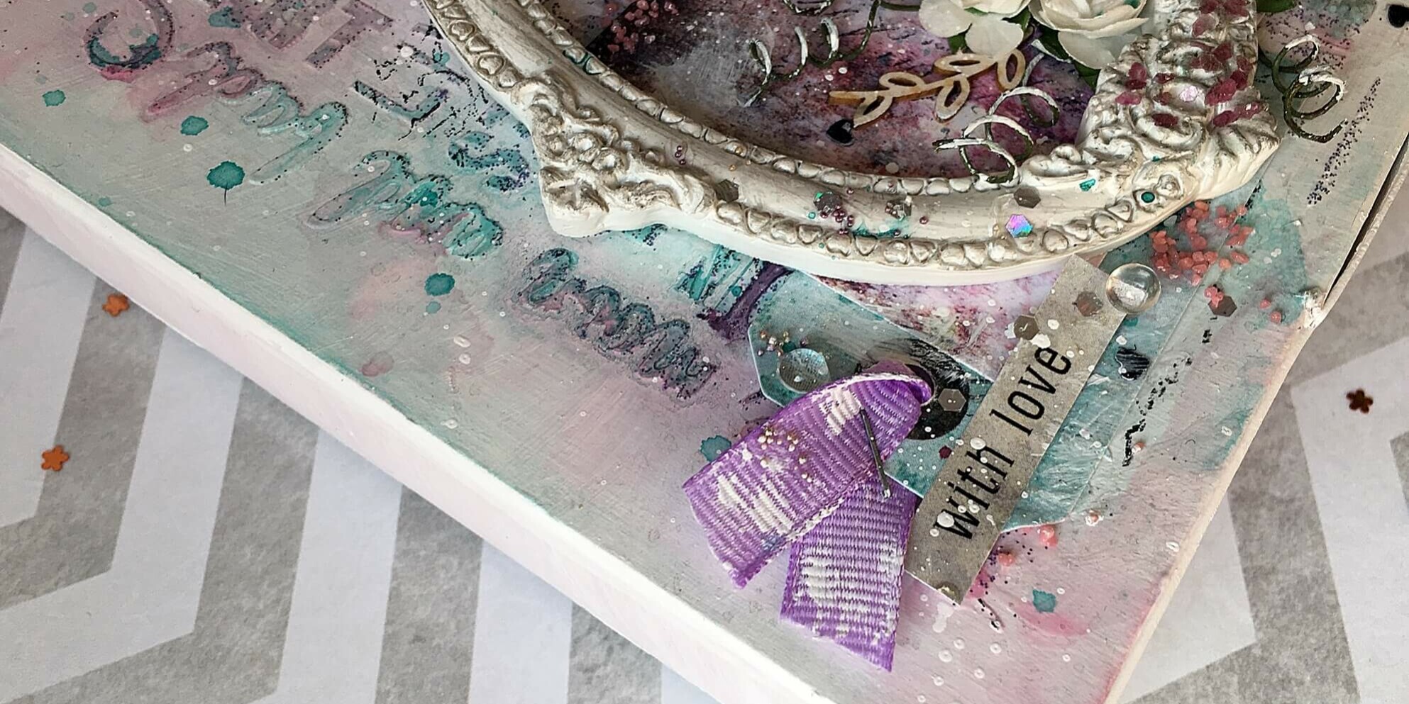 Az alap egy cherry queen-es doboz (esküszöm, nem beszéltem össze Erikával :D), amit ipari mennyiségű fehér gessoval igyekeztem fehérré varázsolni – de ez kb 6 réteg után is csak úgy-ahogy sikerült. A fennmaradt oldalait még majd átkenem egyszer-kétszer 🙂 Amit mindenképp tudtam, hogy türkiz-lila lesz, és hogy a keretet rá szeretném tenni. Alapozás után stencileztem a doboz tetejét – sosem szoktam telibe használatba venni a stencileket, de ide most így tetszett -, majd mielőtt megszáradt volna, szórtam bele lila csillámport. Így beleragadt a kis feliratokba, száradást követően pedig egyszerűen lefújkáltam róla a maradékot (ezt javaslom teraszon megtenni, nekem most a fél nappali lila csillámban pompázik – a gyerek is :D). Miután megszáradt, bélyegeztem, majd színeztem: pasztell türkiz illetve piszkos rózsaszín mistekkel, jól felhígítva. A hátterem késznek érezztem, így jöhettek a rétegek: Cotton Candy tagek, plusz egy sk, a Northern Lights kollekcióm egyik maradék papírjából vágtam ki egy nagy taget. Lyukasztottam őket, majd a lila szalagot megtűztem, és a tagekre is bélyegeztem (ez annyira nem látszik végül). Utána jött a keret, a kistündérke, ágacskák és a csillagos chipboard, ezek színezése (zöldeskék selyemporral illetve a piszkos rózsaszín misttel), papír virágok, sizzix vágat, Dreamscapes szómatricák, ezüst cérna és egy aranyszín h betű. A “szórós” díszítőelemek ezúttal a hexagon hologramcsillámom, a virágos konfetti, a fekete szívecske konfetti, néhány mini üveggolyó, rózsaszín és kék darák és világoslila mica pehely. Legvégül fehér fröcskölés és egy kis fehér gesso, hogy tompítsak a színeken – nekem így picit babásabb 😉