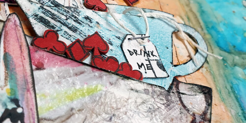 Alíz csodaországban kihívás során arra gondoltam, hogy tulajdonképpen én a TandiArtos cukiságokkal naponta csodaországban járok. Így ebben a hónapban ebből a mesevilágból építettem meg a kihívásra készített art journalomat egy régi könyvben. Az oldalpáron különböző TandiArt papírkészletekből válogattam össze a meseszereplőket. A mese állandóan teázós hangulatát pedig egy TimHoltz vágókéssel készítettem elő: kivágtam a csészikéket.