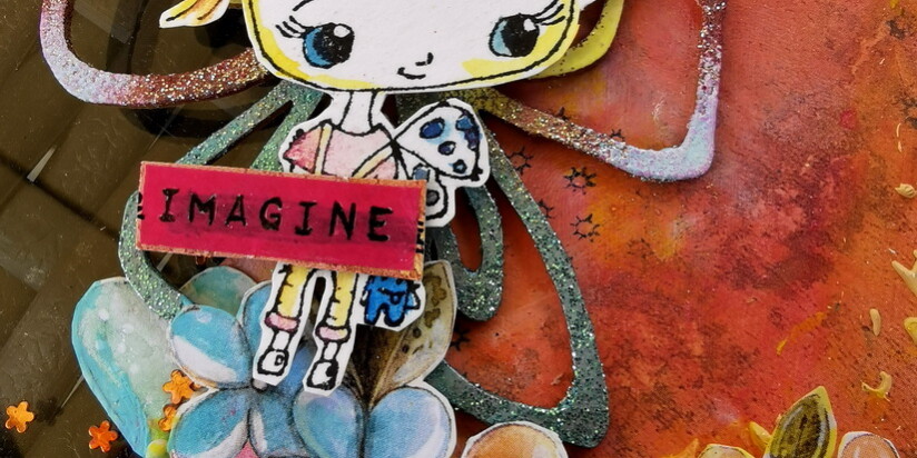 A felső részen helyet kapott egy Tandis chipboard pillangó, amit sima és csillámporos embossing powderrel fedtem be – ez adja a szárnyait a Tandis csigacopfos kislánynak, amit a szivárványig a Craft O’Clock új virágai kötnek össze. Lent pihen egy unikornis, valamint sok kagyló bújik még el a virágok alatt, amit szintén a csillogós waxokkal színeztem. A feliratok az Essentials színes washik, amiket pici alappapírra ragasztottam. Extra díszítésként kapott egy kis golyószórást és csillogós kis 3D csillagok (13 arts) dobják fel a kész alkotást.