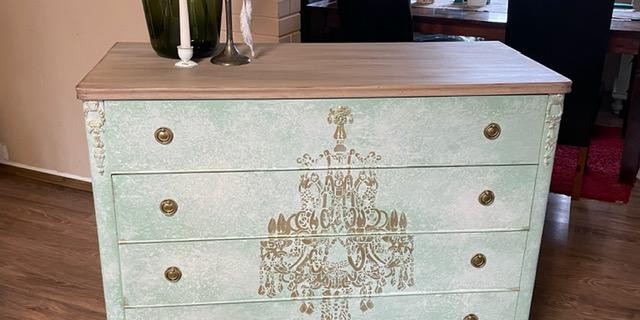 A végleges színhatás elérése után a bútor közepére felkerült a Redesign új és hatalmas csillár stencilje, melyet waxolás után szintén Redesign termékkel Eternal színű Decor Waxal ecseteltem fel a felületre. Ennek száradása után ugyanezzel az arany waxal kiemeltem a szilikonformával készített díszek formáját is.