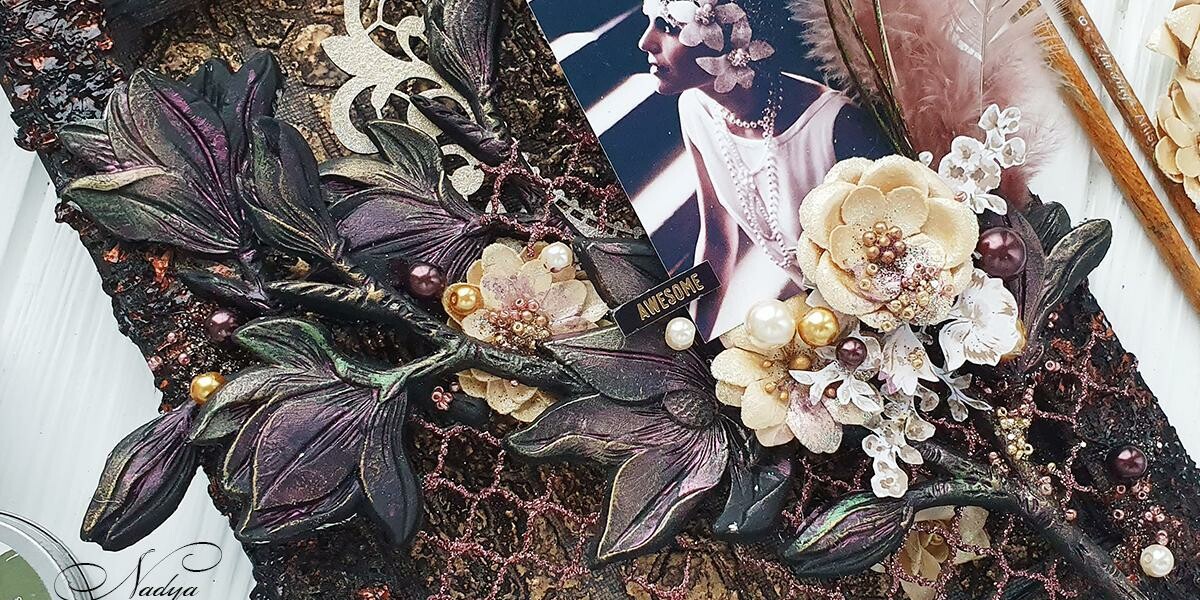 I feel very happy and proud to show you my canvas here. The theme Great Gatsy seemed to be very difficult for me. I decided to start with photo. I found this nice picture, added some clay flowers that are perfectly match with the flowers on women’s hat. I made my project in dark shades with gold touches. Hope you like it.