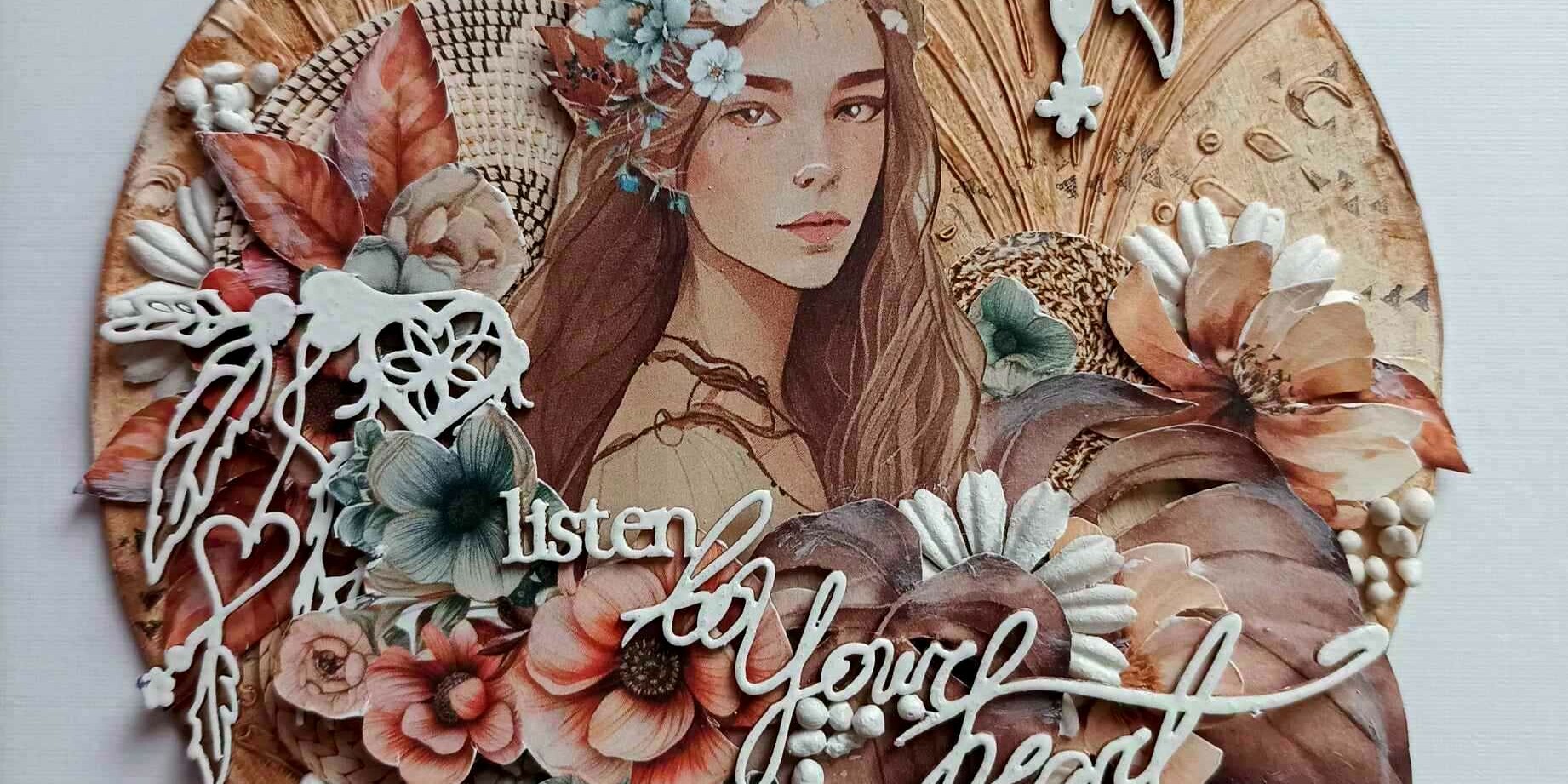 Száradás után befestettem többféle színnel a hátteret (alul találjátok milyen festékeket használtam), majd jött az elemek felragasztása. Középre került a bohó leányka és utána sorra kerültek a virágok és a levelek.