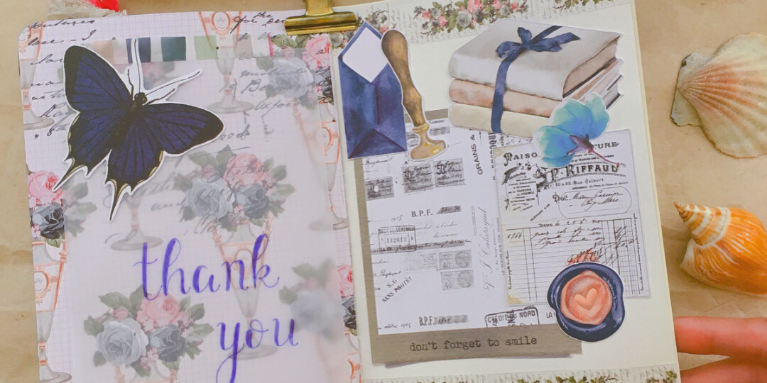 A következő oldalon elfedtem a kitépett oldalt egy teljes oldal méretű csoda mintás papírral és egy átlátszó papírra felírtam a ‘thank you’ feliratot, amit washival rögzítettem így felhajtható maradt a papír.