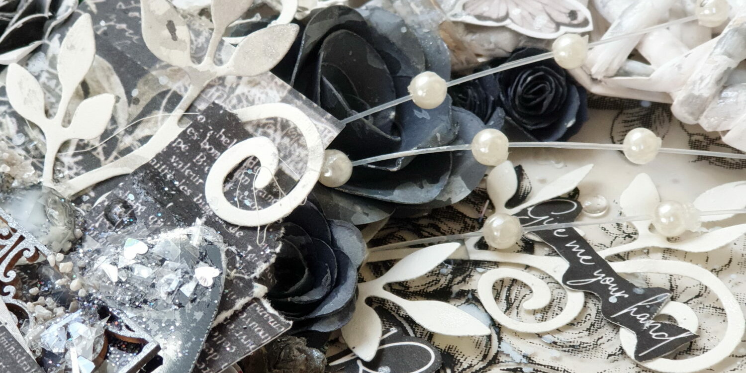 A háttér fólia volt az, amit elsőnek kiválasztottam, hiszen ez szerelem volt első látásra, amikor megjelent a webshopban. Azóta keresem a megfelelő alkalmat a felhasználására. Ehhez kiegészítő elemként volt még pár maradék kivágatom a leveles fóliából és a pillangósból is, amit most szintén felhasználtam. A 13artsnak nagyon sok terméke passzolt nekem most ehhez a kihíváshoz, így főként ezen papírkészletekből készítettem a fotóm alá az alapot, ezekből készítettem a szürke rózsákat, az alkotás végén felkerült szó kivágatok és címkék is főként innen kerültek kiválasztásra. A rózsák készítésekor szürke alapkarton mellett, felhasználtam a stencilek háttérpapírját is, mert írásos motívum mellett szürkés – feketés színt adtak a virágoknak. A dekorom alapjának egy szív formát választottam, hiszen ez is, mint fő motívum jelent meg a moodboardon. A Vintage flowers fóliát a csodálatosan mindent ragasztó Magiccel rögzítettem, majd szintén ezzel került fel minden elem a helyére.
