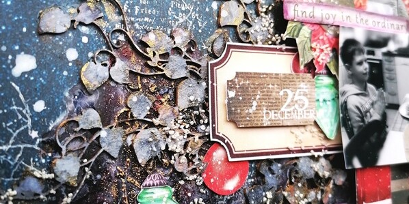 A Mintay készletéből kivágtam néhány díszt és kártyát, ezeket rétegeztem a fotó alá. Mivel túl pirosnak találtam, a 7 dots Yuletide kivágatokkal kicsit ellensúlyoztam ezt. Felkerültek a csipik is, amiket arany festékkel, fekete misttel és fehér gessoval színeztem. Végül pacáztam kicsit, és fehér színű darát is szórtam néhány helyre.