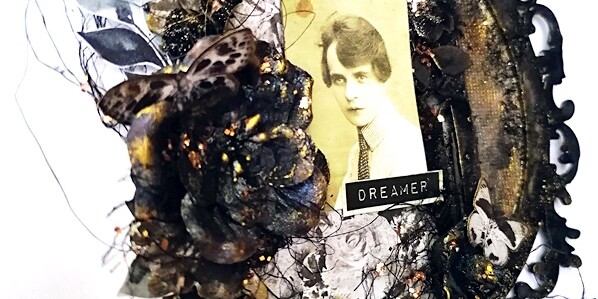 A kivágatok széleit fekete tintával simogattam át, majd kaptak egy leheletnyi arany színű waxot is. Csipke helyett szizált és fekete hálós anyag cafrangokat használtam. Sokáig próbálkoztam egyébként a szívószál elhelyezésével is, de nekem ehhez a kompozícióhoz már nem tetszett annyira, így azt végül elhagytam.